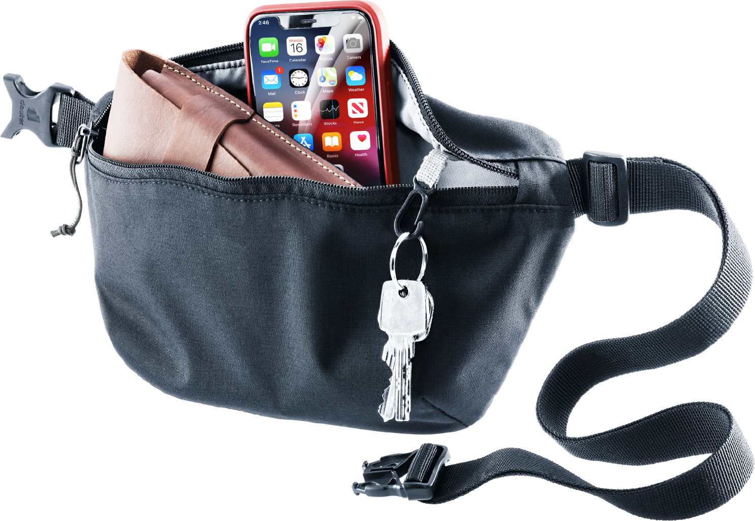 • zipped front pocket with key clip